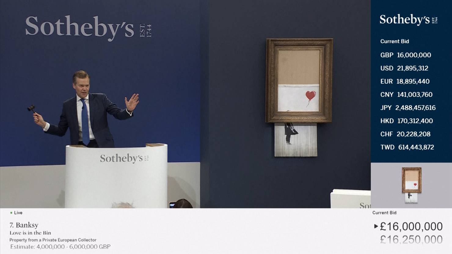 Von WELT Nachrichtensender Veröffentlicht am 15102021. L ondon dpa - Ein Bild des Street-Art-Künstlers Banksy hat sich kurz nach seiner Versteigerung in London selbst zerstört. Gut drei Jahre nach seiner teilweisen Zerstörung ist das halb geschredderte Banksy-Werk Love is in the Bin für 16 Millionen Pfund 1889 Mio Euro plus Gebühren versteigert worden.